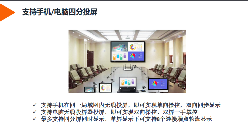 會(huì)議平板系統(tǒng)界面簡(jiǎn)潔功能強(qiáng)大支持市面常用的文本、圖片、音頻和視頻等多種格式。 打開PPT、Excel等文件或播放視頻的狀態(tài)下,都可以在屏幕上進(jìn)行手寫批注。 邊播放邊圈點(diǎn),隨意批注,不用另外找白板;多屏支持無線投屏手機(jī)、平板、電腦不需要網(wǎng)絡(luò),融創(chuàng)方圓會(huì)議平板都支持Andriod、IOS、Windows、Mac OS系統(tǒng)設(shè)備無線投屏,還支持U盤直插直讀。