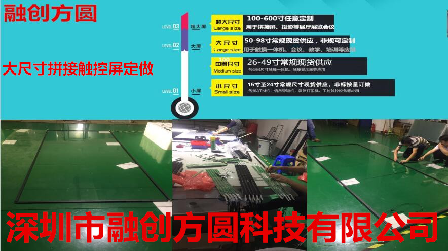 3、融創(chuàng)方圓大尺寸拼接觸摸框在方便運設計采用是可拆裝成4條邊包裝,大大節(jié)省運輸成本、運輸?shù)浆F(xiàn)場安裝施工簡單方便,出廠每一個規(guī)格紅外框邊標好A、B、C、D四個字母,將四個字母對應后對端子排線連接起來,一根USB數(shù)據(jù)線連接(屏幕離主機比較遠可外用網(wǎng)線加信號放大器傳輸)操作系統(tǒng)即可以使用,安裝現(xiàn)場多樣性。