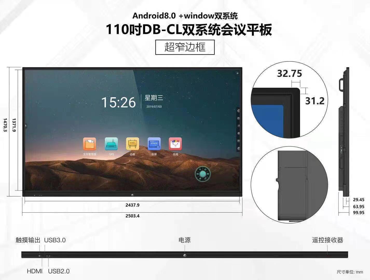 110寸高清觸摸一體機(jī)也是叫110寸會(huì)議平板,110寸高清觸控一體機(jī),110寸教學(xué)培訓(xùn)觸控一體機(jī),110寸展廳觸摸一體機(jī),110寸高清交互會(huì)議機(jī),110寸展示查詢觸摸一體機(jī),110寸移動(dòng)壁掛觸控顯示屏尺寸:2503.4×1470.3×99.95mm,100寸雙系統(tǒng)會(huì)議平板顯示區(qū)域:2437.9×1371.9MM
