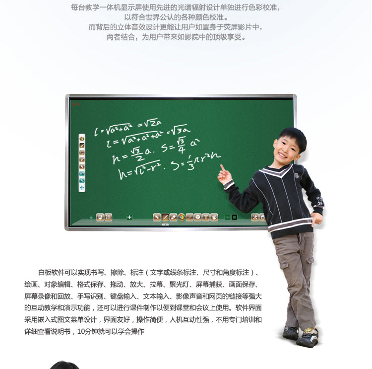 功能多多科技產(chǎn)品證明集成一體化多媒體教學一體機里面,多角度、全方位大屏呈現(xiàn),是一種極有效的幼兒教育方法,促進了老師教育活動過程中:“教”的有效性和趣味性,提高幼兒“學”的積極性和主動性,特別是對幼兒注意力、觀察力、記憶力、理解力、想象力的發(fā)展,起到了其他手段不可替代的作用。